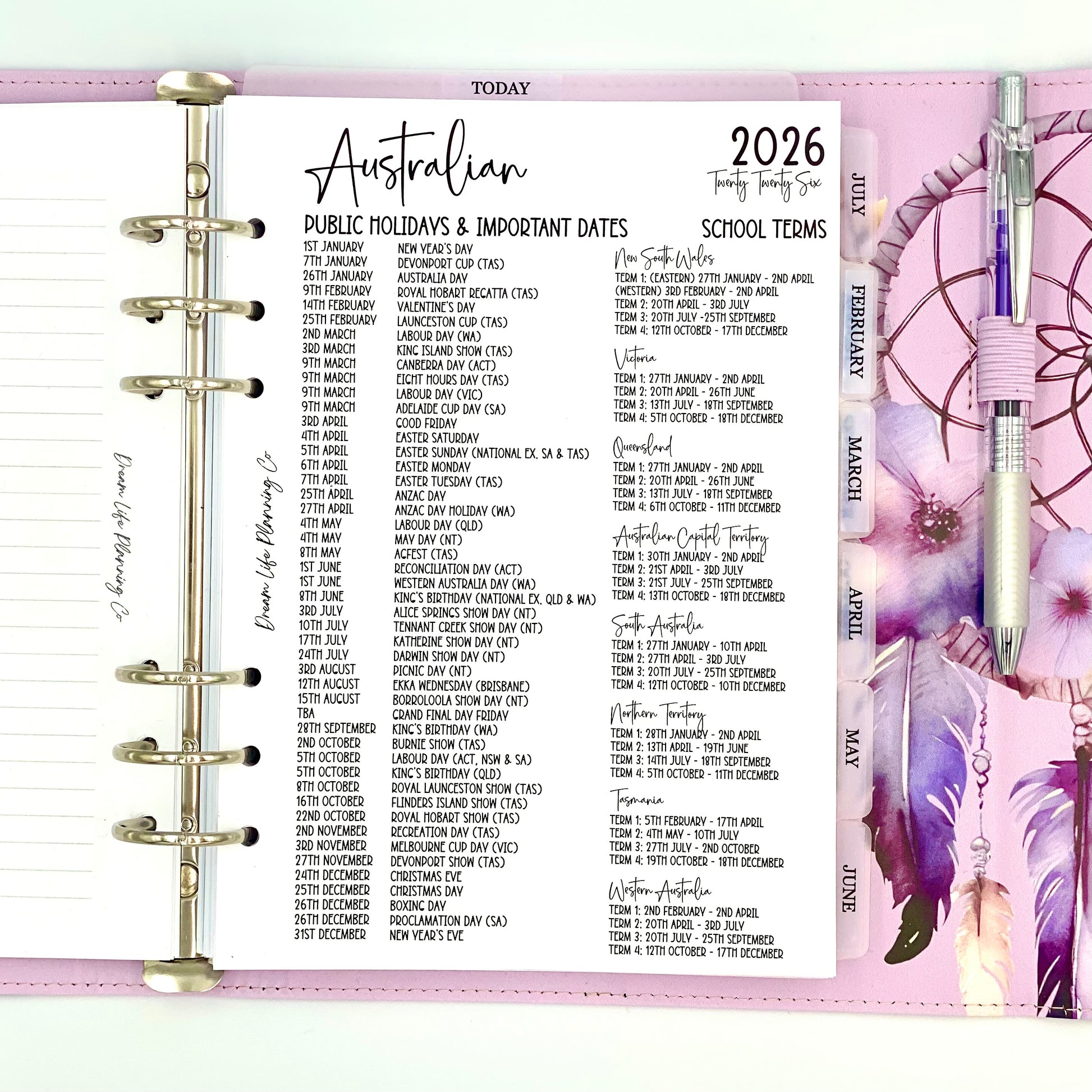 Reference 2026 important dates, public holidays & school holidays easily, with our 2026 A5 Australian Public Holidays, Important Dates and School Holidays Planner Refill Inserts.